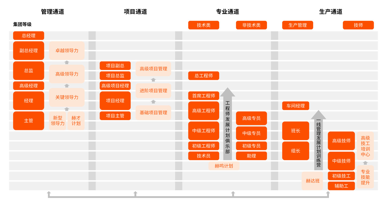 通過(guò)管理、項目、專(zhuān)業(yè)和生產(chǎn)四個(gè)通道的人才發(fā)展體系,實(shí)施不同類(lèi)別、不同層次的人才發(fā)展項目,實(shí)現公司在人才挑選、培養、發(fā)展、使用和保留等關(guān)鍵環(huán)節的全面提升
